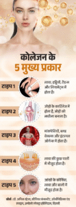 अभी तक कोलेजन के 28 प्रकारों की पहचान की जा चुकी है। इसमें पता चला है कि कोलेजन न सिर्फ त्वचा को चमकदार बनाता है, बल्कि शरीर में कहीं कट लगने पर बखून का गाढ़ा करके परत बनाने में मदद करता है, मृत त्वचा कोशिकाओं को बदलता है और अंगों के लिए सुरक्षात्मक परत बनाता है। ग्राफिक में इसके 5 मुख्य प्रकार देखिए: