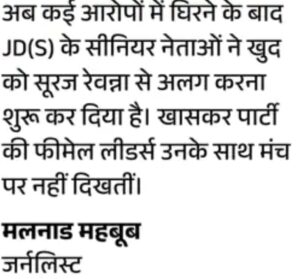 JD(S) के सीनियर नेता सूरज से बना रहे दूरी, महिलाएं मंच पर नहीं जातीं इस केस को शुरू से कवर कर रहे कर्नाटक के जर्नलिस्ट मलनाड महबूब का मानना है कि प्रज्वल और सूरज पर लगे यौन उत्पीड़न के आरोपों के बाद JD(S) की सियासी छवि पर बड़ा डेंट लगा है। यही नहीं, पार्टी के सीनियर लीडर्स भी सूरज से किनारा करने लगे हैं।