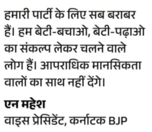कर्नाटक BJP के स्टेट वाइस प्रेसिडेंट एन महेश कहते हैं, ’प्रज्वल और सूरज रेवन्ना ने जो कुछ भी किया वो उनका और JD(S) का पर्सनल मैटर है। BJP कर्नाटक की हर एक महिला के साथ खड़ी है। हमारी पार्टी ने यहां की लड़कियों के लिए नौकरी में रिजर्वेशन और जनता के सम्मान की लड़ाई लड़ी है।’