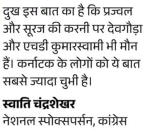 कांग्रेस: JD(S) को आगे बढ़ना है तो ‘रेवन्ना’ शब्द से दूरी बना ले कांग्रेस की नेशनल स्पोक्स पर्सन स्वाति चंद्रशेखर कहती हैं, ‘JD(S) को अगर आगे बढ़ना है, तो उसे ‘रेवन्ना’ शब्द से ही दूरी बना लेनी चाहिए। प्रज्वल केस में महिलाओं का यौन शोषण हुआ। उसके भाई सूरज ने तो पुरुष पार्टी कार्यकर्ताओं को भी नहीं छोड़ा। ऐसा लग रहा है कि पूरे रेवन्ना परिवार ने कर्नाटक के लोगों पर अत्याचार करने का ठेका ले लिया है।‘