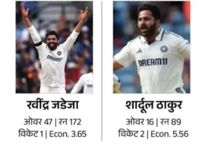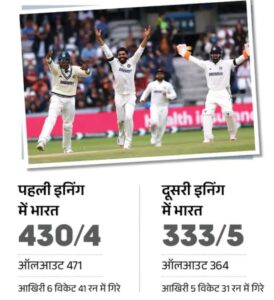 पहली पारी में करुण नायर शून्य, रवींद्र जडेजा 11 और शार्दूल ठाकुर एक रन बनाकर आउट हुए। इससे भारत पहली पारी में 500 के पार नहीं जा सका। दूसरी पारी में करुण नायर 20, रवींद्र जडेजा 25 और शार्दूल ठाकुर 4 रन बनाकर आउट हो गए। इस बार टीम इंग्लैंड को 400 पार का टारगेट नहीं दे सकी। जबकि, टीम ने दूसरी पारी में 5 विकेट पर 333 रन बना लिए थे।