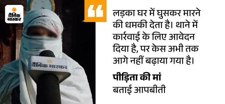 इसी बीच पीड़िता का भाई मिला। उसने अपनी मां से हमारी मुलाकात कराई। जिसके बाद मां-बेटे ने पूरी कहानी बताई। मां का कहना है कि जिस लड़के ने हमारी जिंदगी बर्बाद कर रखी है। उसे हमने अपना माना था। हमारी जाती भी एक है। उसके परिवार वाले भी उसे नहीं समझा रहे हैं। इस कारण उसने हद पार कर दी है। उसके कारण मैंने अपने बच्चों को कॉलेज भेजना भी बंद कर दिया है।