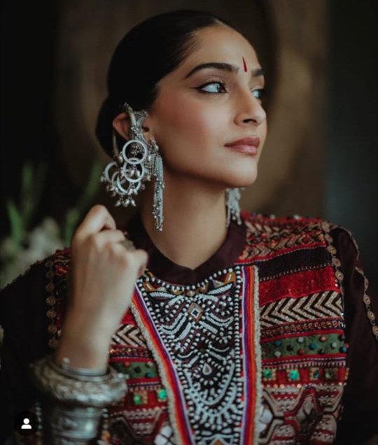 सोनम के एक्सेसरीज़ भी उतने ही विचारशील थे—अर्धचंद्राकार पैचवर्क बैग उनके कुर्ते की कारीगरी को पूरा करता है, वहीं The Row के मोकासिन्स ने लुक में एक आधुनिक वैश्विक स्पर्श जोड़ा। पन्ना और पोल्की झूमर वाले झुमके हल्के से चमक रहे थे, जबकि खुले बाल और न्यूनतम मेकअप ने उनके लुक को understated elegance दिया।